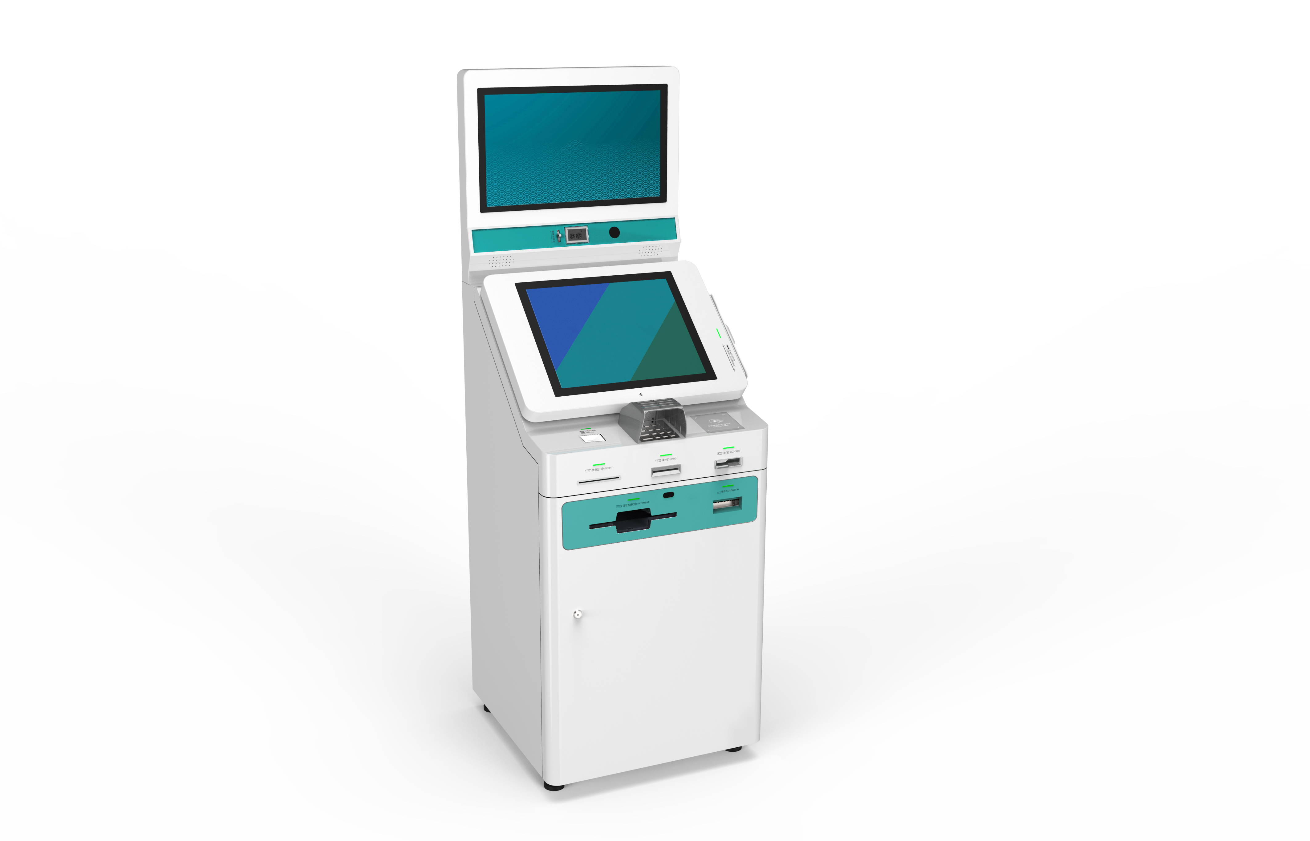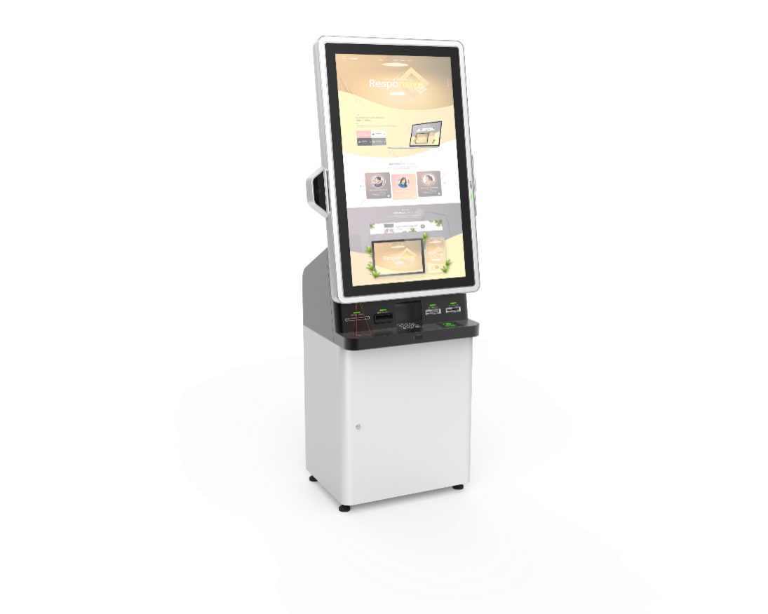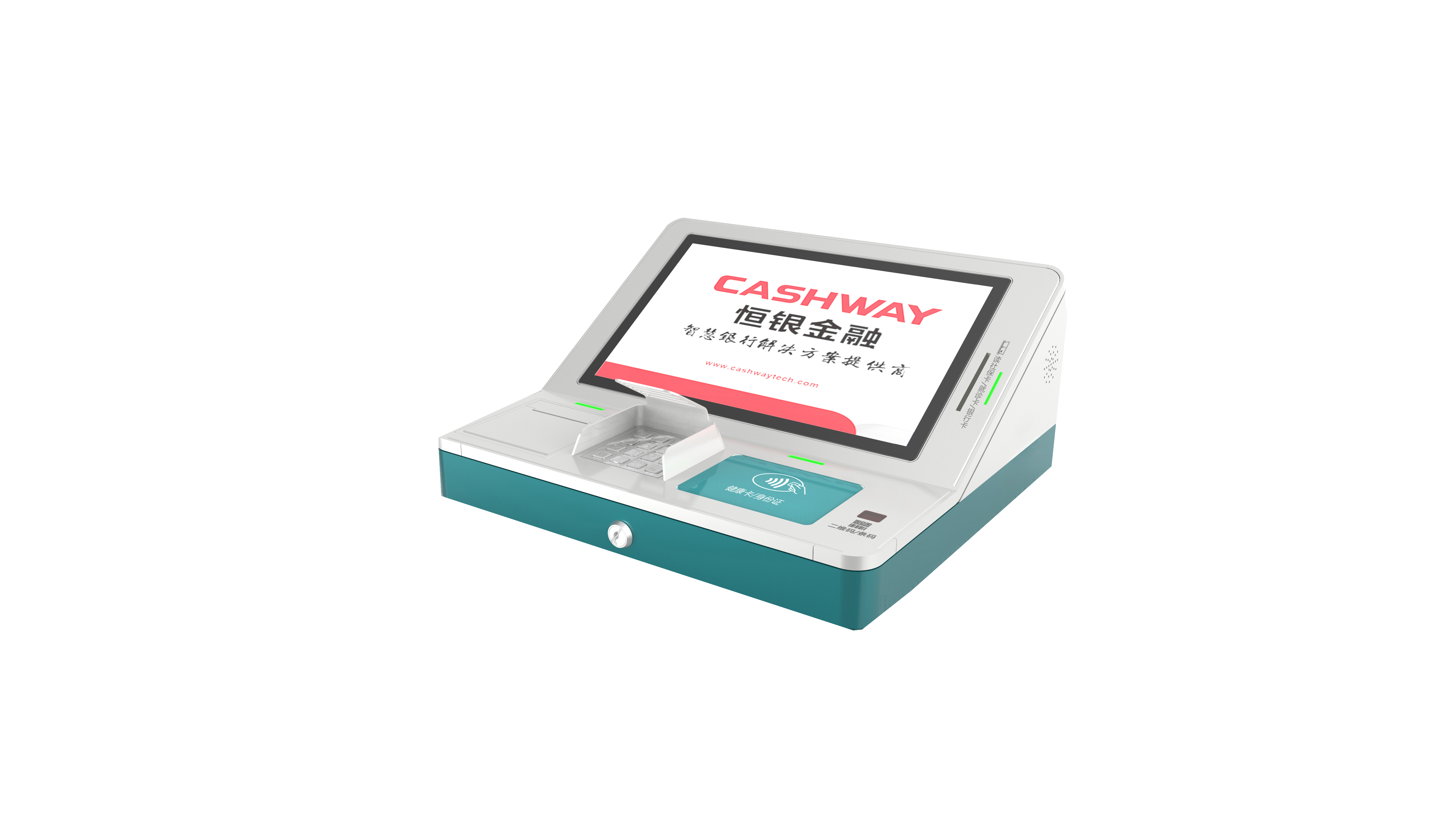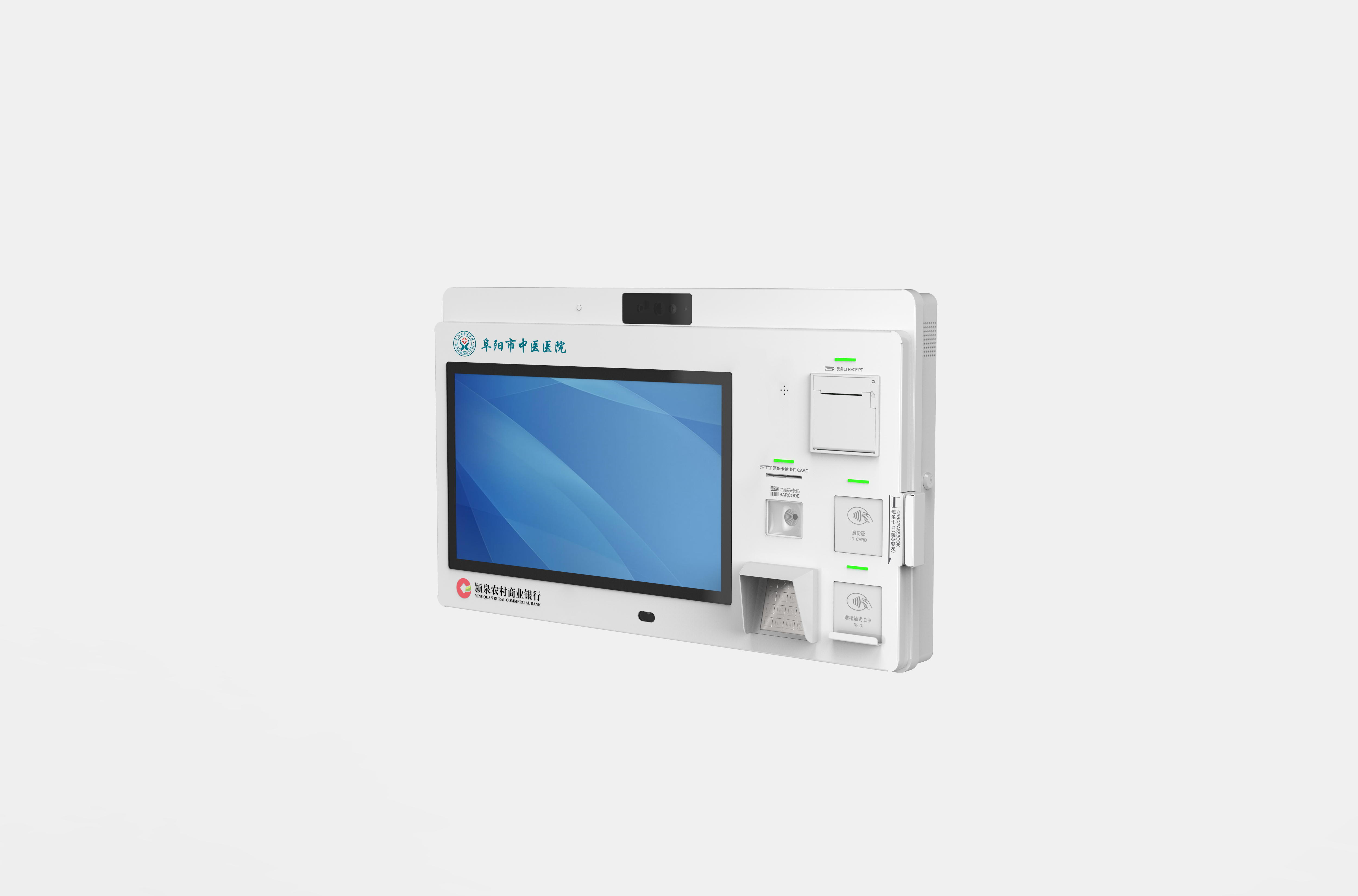 桌面型自助终端包括主控模块、显示模块、金融卡/医保卡读取模块、非接二合一读卡器、条码扫描器、银联密码键盘、凭条打印机等部分组成